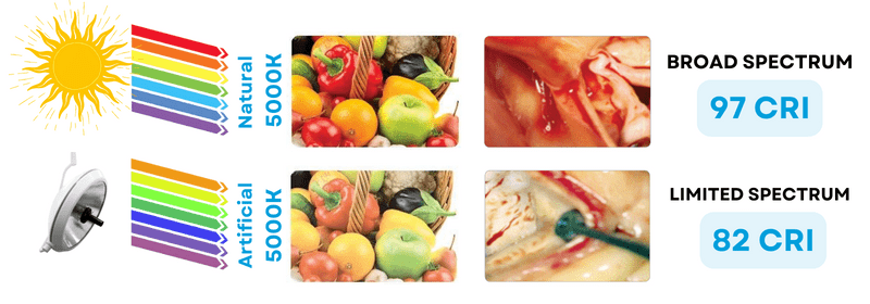 When examining a condition or identifying critical aspects of the human anatomy it is critical to be able to see a bright and clear field that illuminates the true color of the environment. This would be what you would expect to see outside in natural sunlight. Poor color rendering can lead to misdiagnosis, unnecessary exploration, questions, and even surgical errors.