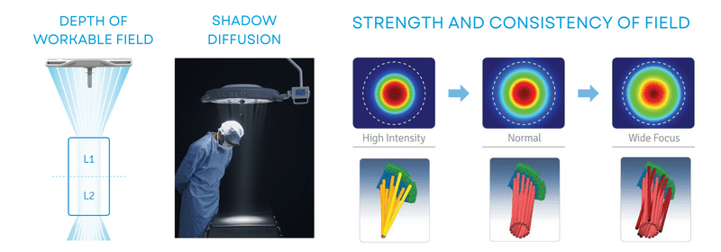 - Depth of Illumination: This is the target area away from the light where bright focused light is provided to the surgery or procedure area. A deep area of workable illumination provides more flexibility in the position of the patient, practitioner, and light head. For a large surgical light head, this would be in the range of 45cm to 65cm.