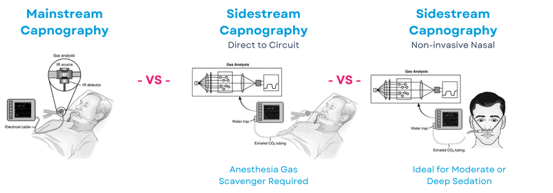 Oxygen enters your body’s bloodstream via the lungs and then travels throughout the body to aid in metabolism.  Your body’s metabolism breaks down the food you eat in order to produce energy, and as a byproduct of this process, your body excretes a gaseous waste product called carbon dioxide (Co2) into your blood. This then travels back to your lungs and exits your body through an exhaled breath.  Capnography refers to the use of a capnograph to measure the levels of exhaled carbon dioxide, or CO2, in the bloodstream.  This is commonly known as End-Tidal CO2 or EtCO2 measurement.  This is an ideal predictor of what a patient’s blood oxygen levels will be in the coming moments and allows practitioners to intervene faster.